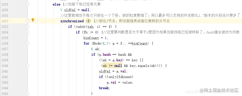 如果当前节点元素不为空,则会使用 synchronized 关键字锁住当前节点(数组中的节点),并进行对应的设值 操作:
