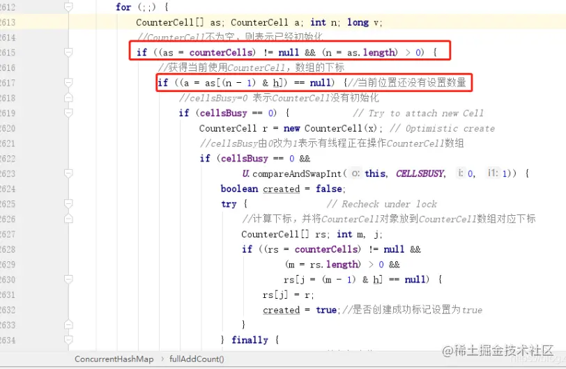 这个方法也很长,看起来比较复杂,里面包含了对 CounterCell 数组的初始化和赋值等操作。