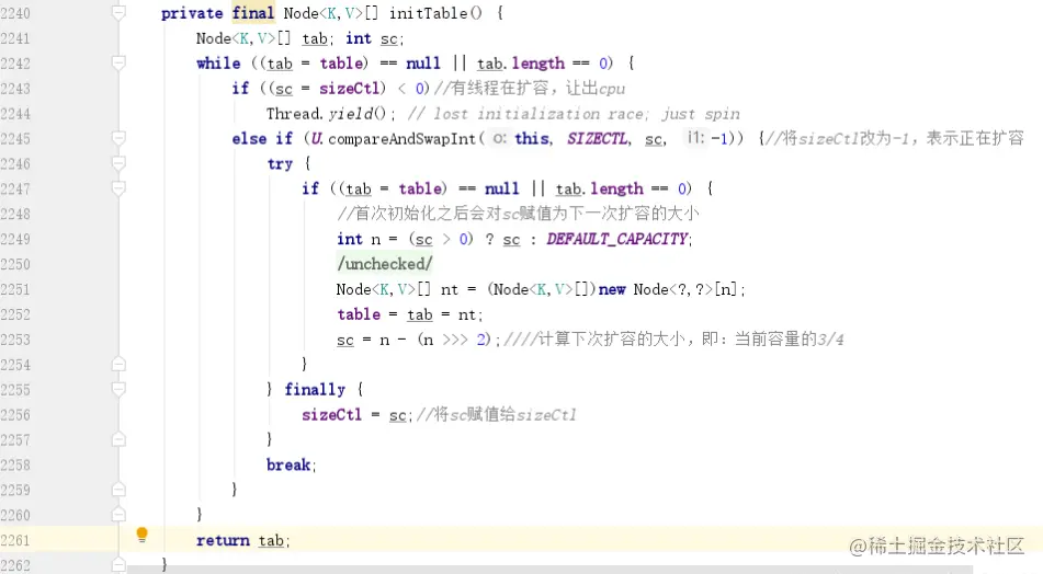 知道了这个变量的含义,上面的方法就好理解了,第二个分支采用了 CAS 操作,因为 SIZECTL 默认为 0,所以这里如果可以替换成功,则当前线程可以执行初始化操作,CAS 失败,说明其他线程抢先一步把 sizeCtl 改为了 -1。扩容成功之后会把下一次扩容的阈值赋值给 sc,即 sizeClt。