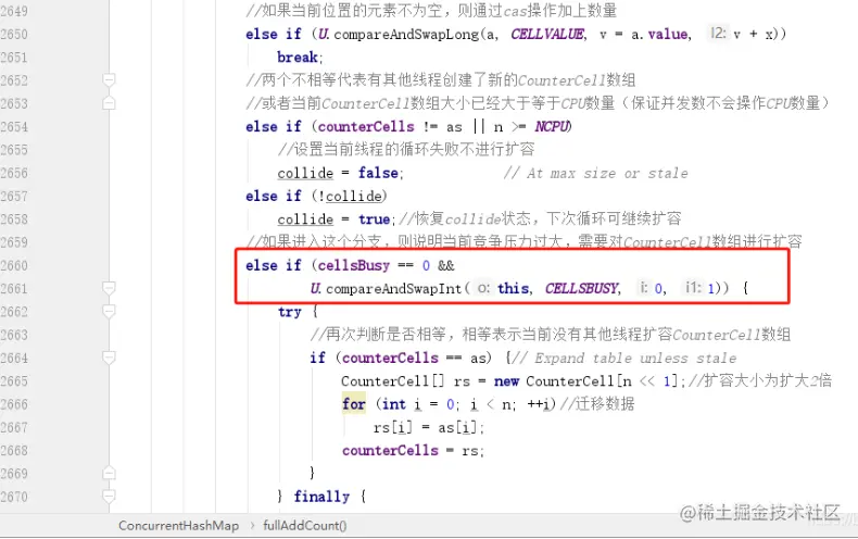 这里面有一个比较重要的变量 cellsBusy,默认是 0,表示当前没有线程在初始化或者扩容,所以这里判断如果 cellsBusy==0,而 as 其实在前面就是把全局变量 CounterCell 数组的赋值,这里之所以再判断一次就是再确认有没有其他线程修改过全局数组 CounterCell,所以条件满足的话就会通过 CAS 操作修改 cellsBusy 为 1,表示当前自己在初始化了,其他线程就不能同时进行初始化操作了。