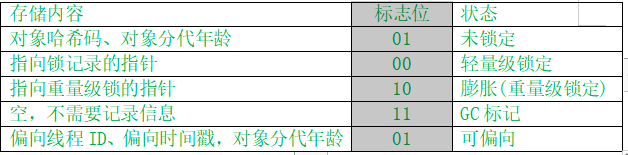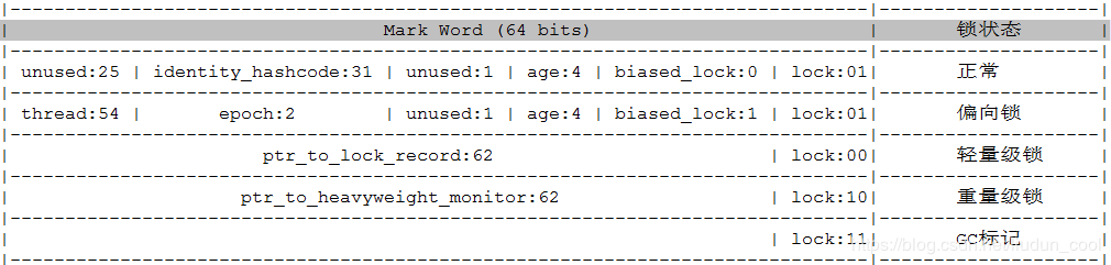 lock的2位是锁状态标记位,该标记的值不同,整个Mark Word表示的含义不同。biased_lock和lock一起,表达的锁状态含义如下: