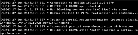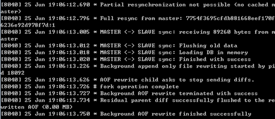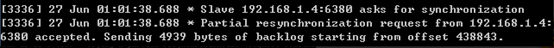 其中,有几点需要注意:从节点接收了来自主节点的89260个字节的数据;从节点在载入主节点的数据之前要先将老数据清除;从节点在同步完数据后,调用了bgrewriteaof。