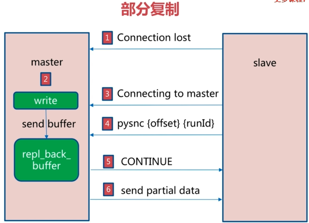 - 如果offset偏移量之后的数据,仍然都在复制积压缓冲区里,则执行部分复制;
