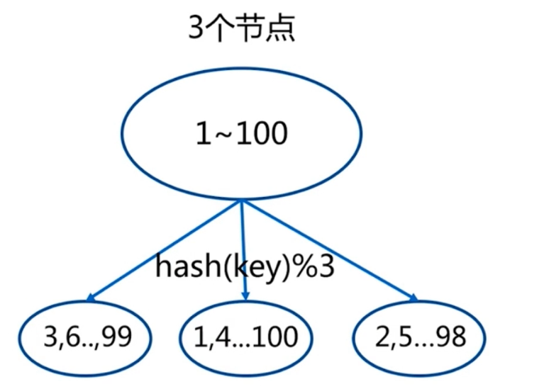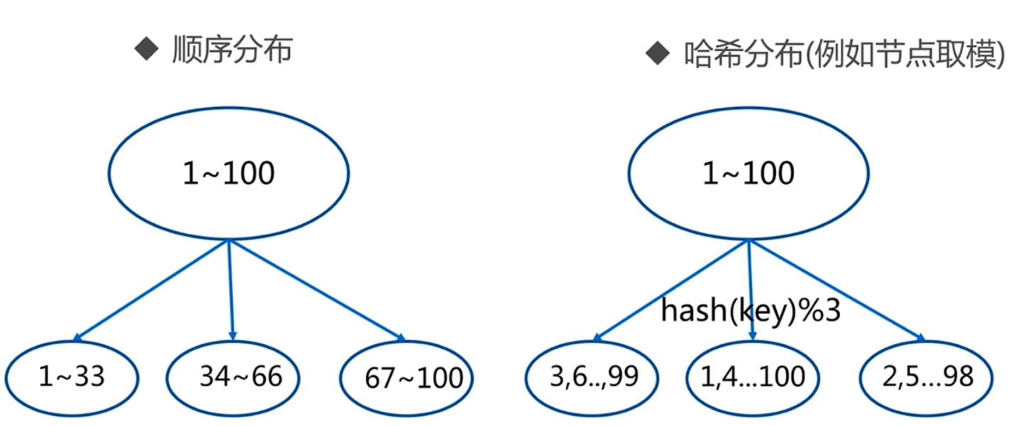| 哈希分布 | 数据分散度高 键值分布业务无关 无法顺序访问 支持批量操作 |
