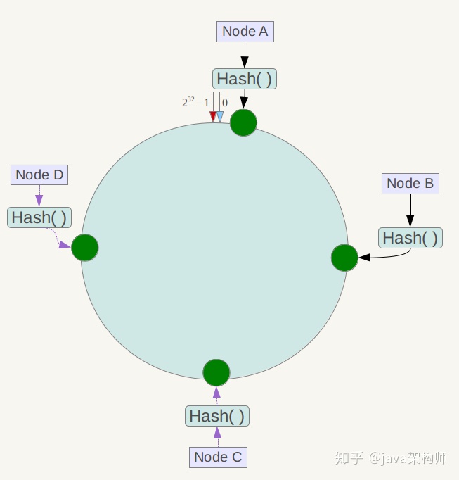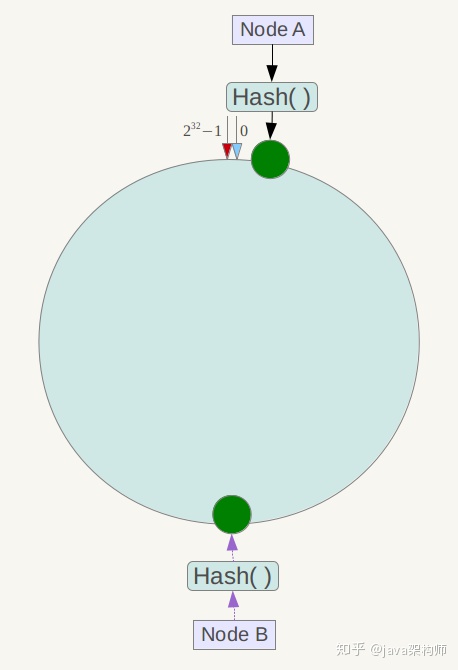 按照常用的hash算法来将对应的key哈希到一个具有$$2^{32}$$次方个节点的空间中,即$$ 0 \sim (2^{32})-1$$的数字空间中。现在我们可以将这些数字头尾相连,想象成一个闭合的环形。(节点的个数可以自定义,整个hash环我们可以用TreeMap来实现,因为treeMap是排序的,我们刚好可以利用上)