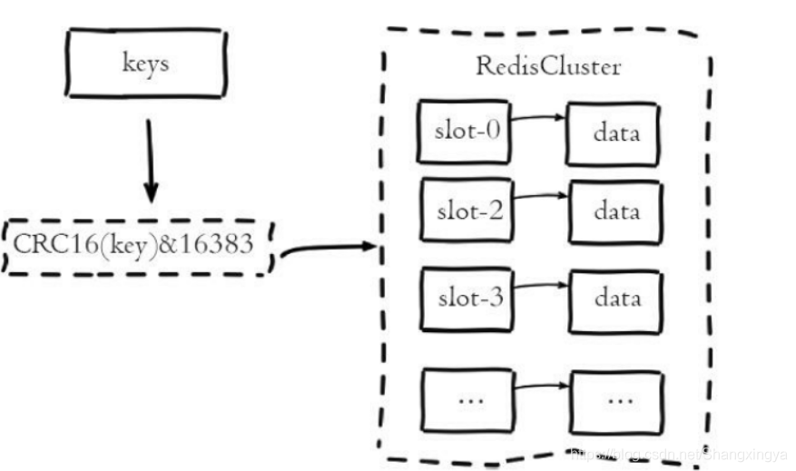 - 采用虚拟槽分区,所有的键根据哈希函数映射到0~16383整数槽内,计算公式:slot=CRC16(key)&16383。每一个节点负责维护一部分槽以及槽所映射的键值数据,如下图所示
